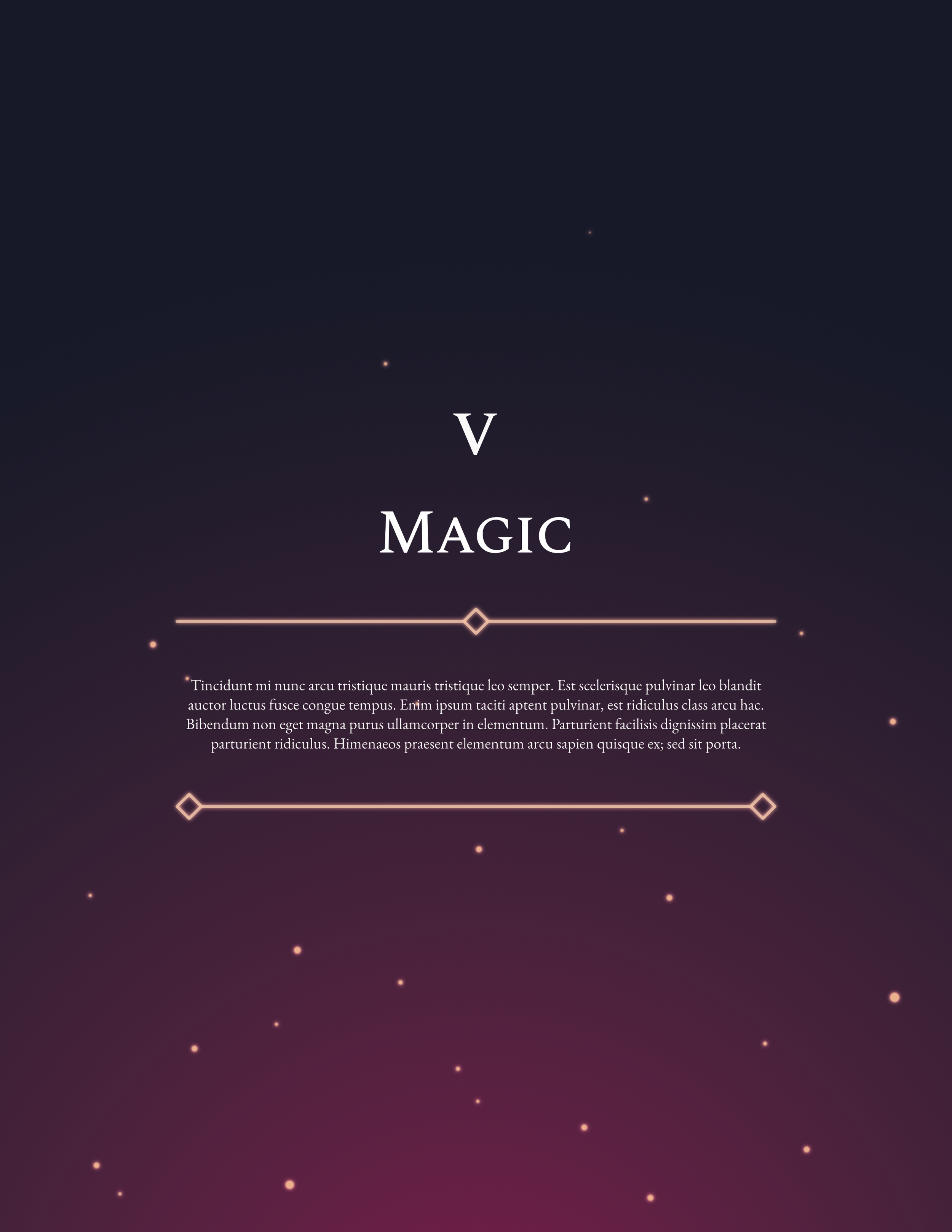 For the chapter heads, we needed something that stood out from the standard pages so they would be easily recognizable while flipping through the book. Most RPG books would rely on art to make that happen, but unfortunately we didn’t have the budget. We had to rely on pure design to have these pages stand out. After some trial and error I finally settled on using the brand gradient and embers, which at this point hadn’t been present in the book, only on the website. To help the body text of the chapter page stand out, I set up some framing decorations that are inspired by simplified versions of the logo underline, and the header decorations. I gave the decorations the same glow as the embers to help ground the text into the design further, and was happy with the result.