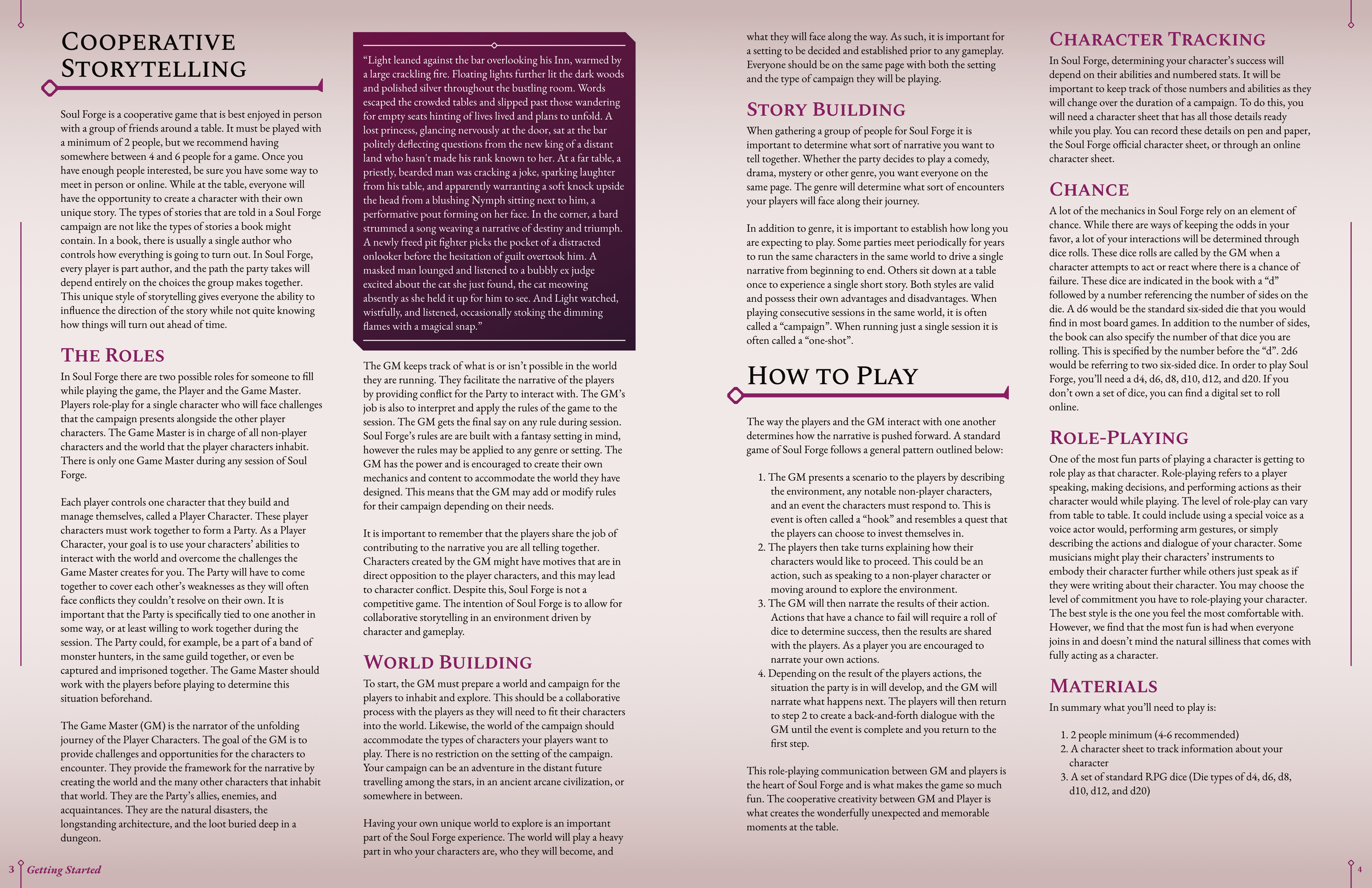 Soul Forge is a Tabletop Role Playing Game the utilizes stats, dice, and player ingenuity to face challenges, create narratives, and forge experiences with a group of friends. It does this through easy to grasp mechanics that are used as building blocks to represent characters and their unique qualities.